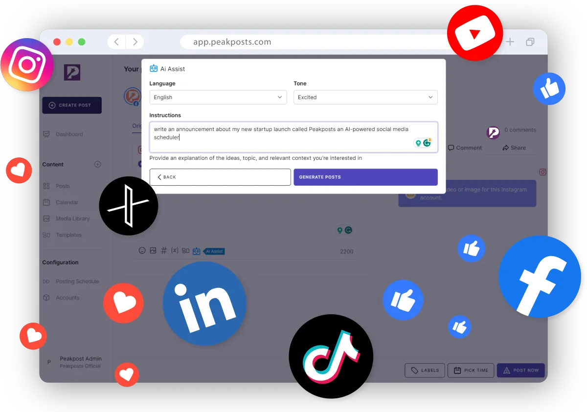 Feed Peakposts a few of your existing posts — it learns your unique tone, humor, and rhythm to match your authentic voice.